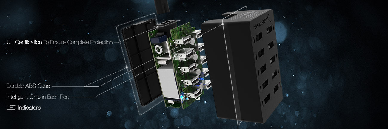 Smart-Port Technology maximizes compatibility with Android, Apple, and other devices, enabling charging power up to 12A among 10 ports, or 3A per port (2.4A compatibility)