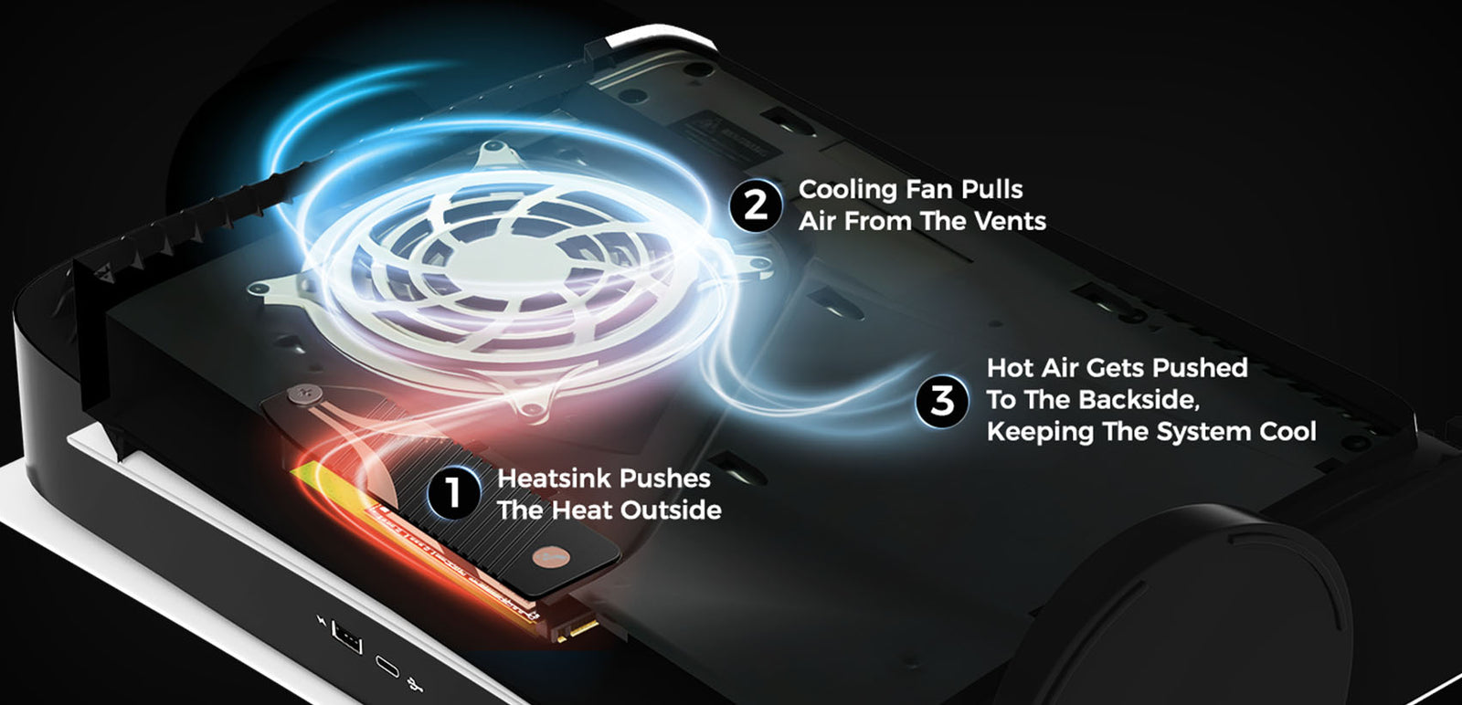 Rather than creating a heatsink that would only trap the heat within the metal cover, we designed a heatsink that replaces the native PS5 cover